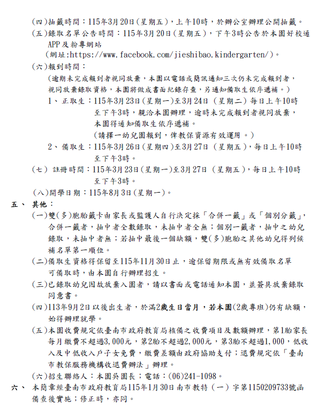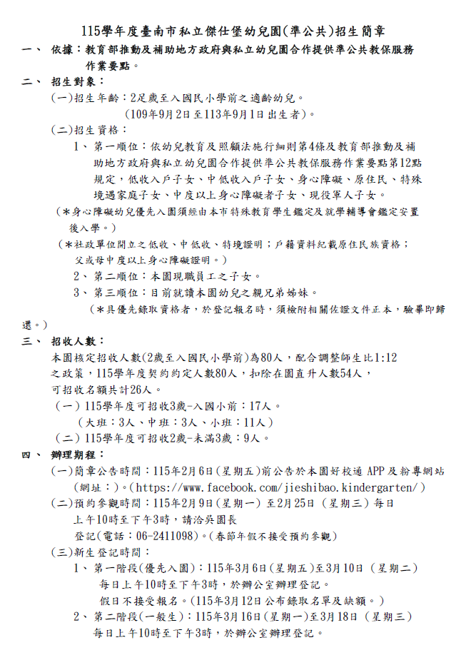 📢【115學年度臺南市傑仕堡幼兒園(準公共)招生公告】本園為臺南市準公共化幼兒園,提供安全、溫馨且具教育品質之學習環境,現公告 115學年度招生資訊,歡迎家長參閱並踴躍報名。👶 歡迎新朋友加入我們的大家庭📣 招生中|歡迎預約參觀#傑仕堡幼兒園☎️預約參觀電話: 06-2411098🏫參觀地址:台南市安平路442號